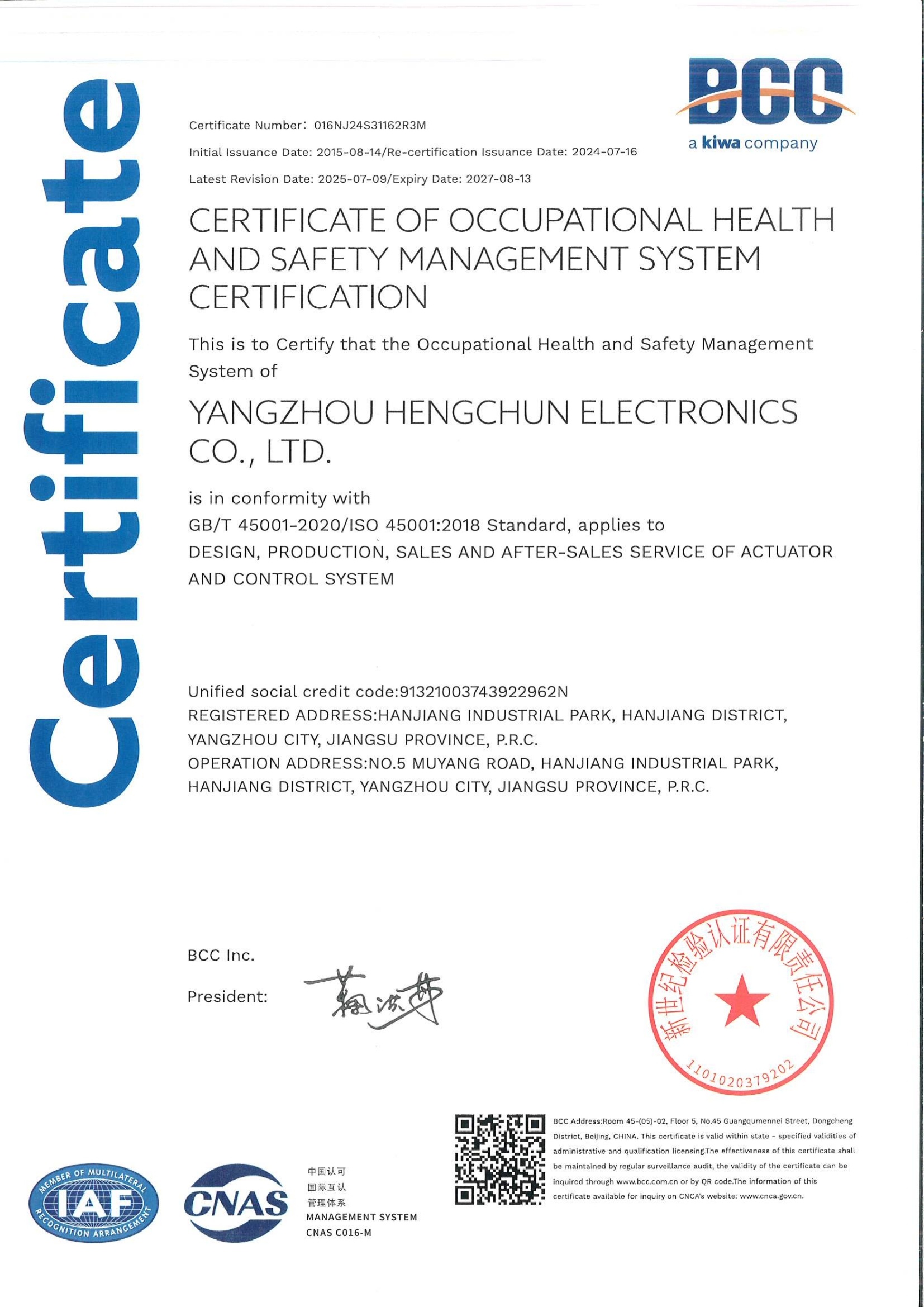 职业健康安全管理体系认证证书