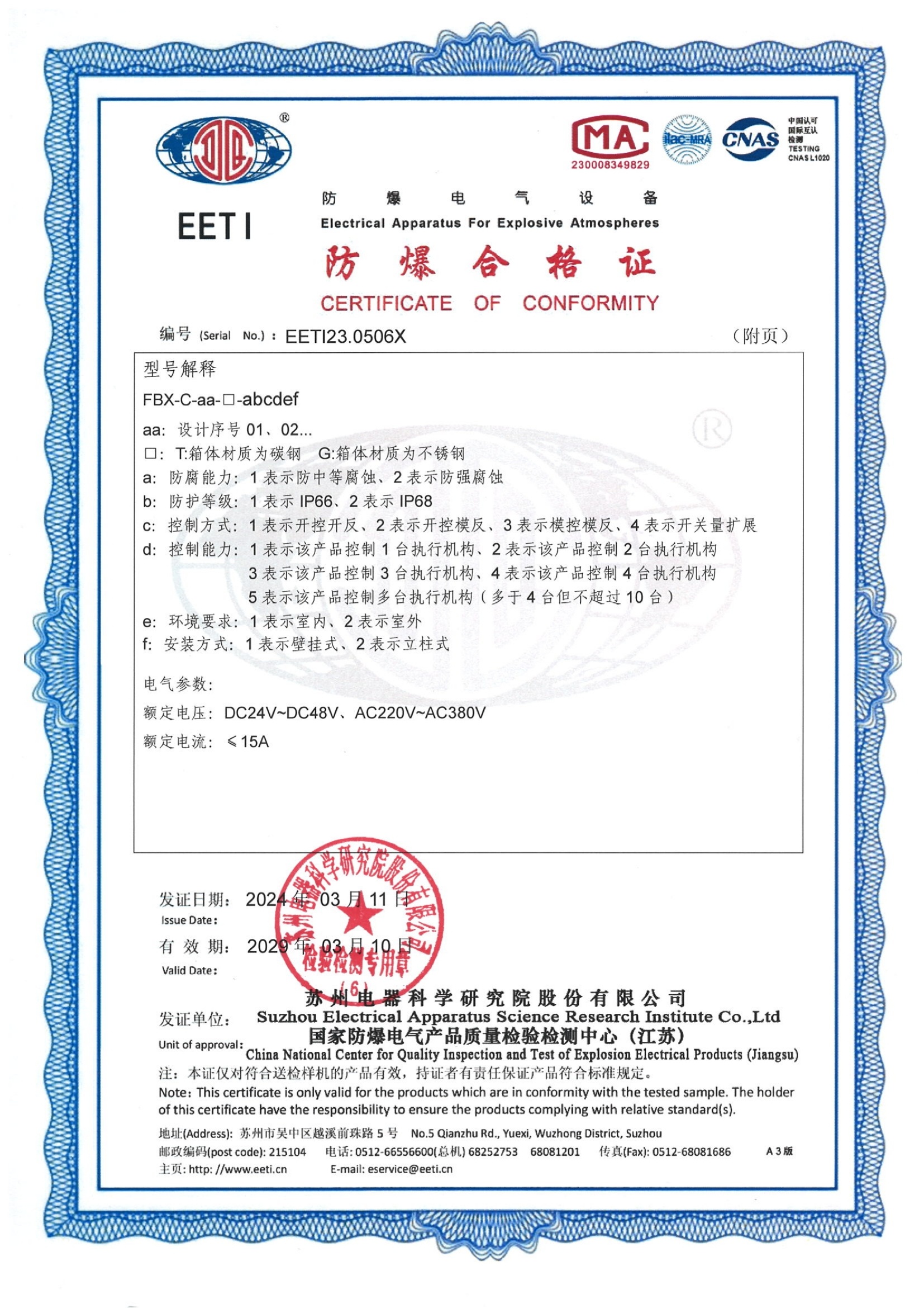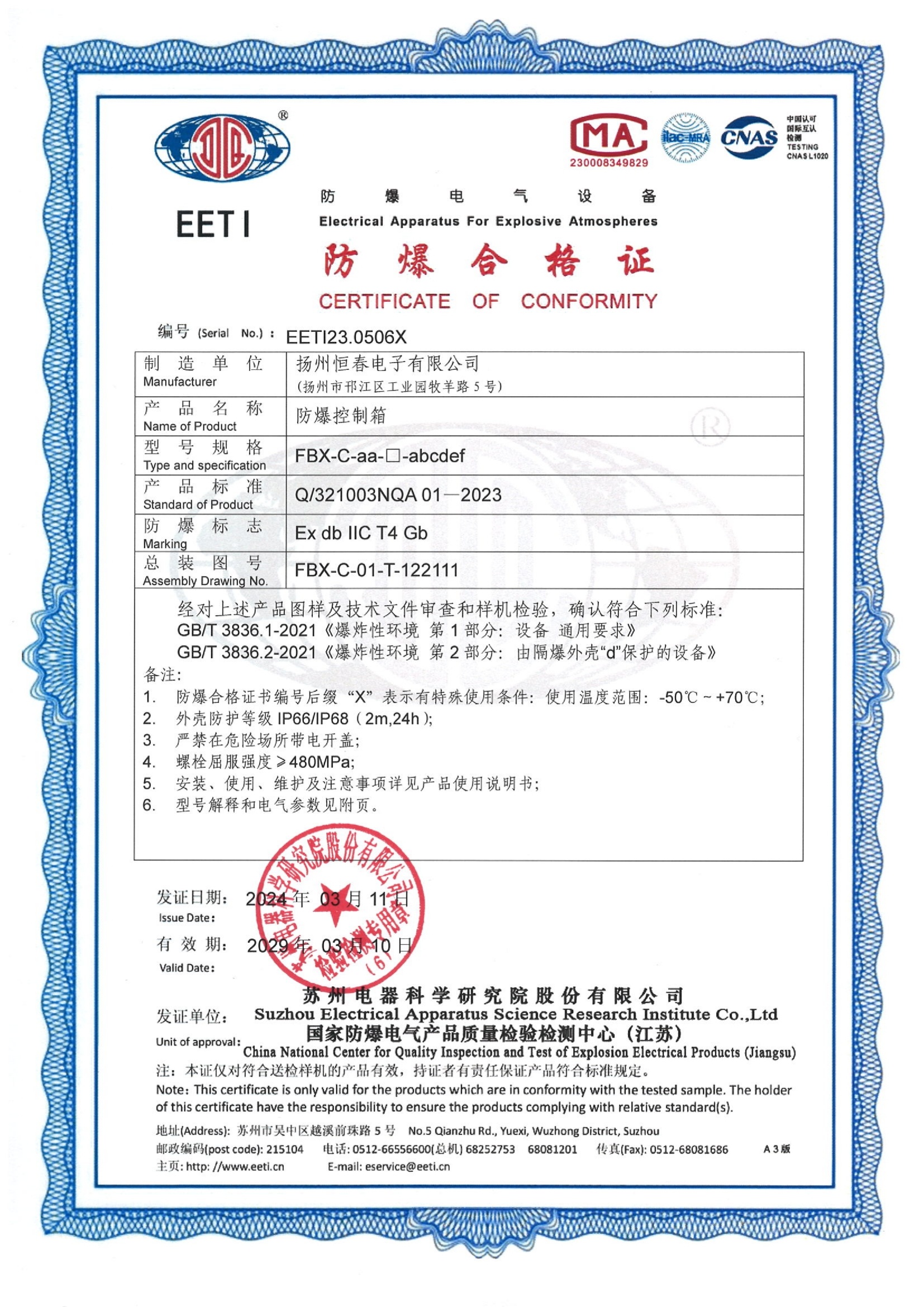EETI23.0506X 防爆控制箱合格证 IIC