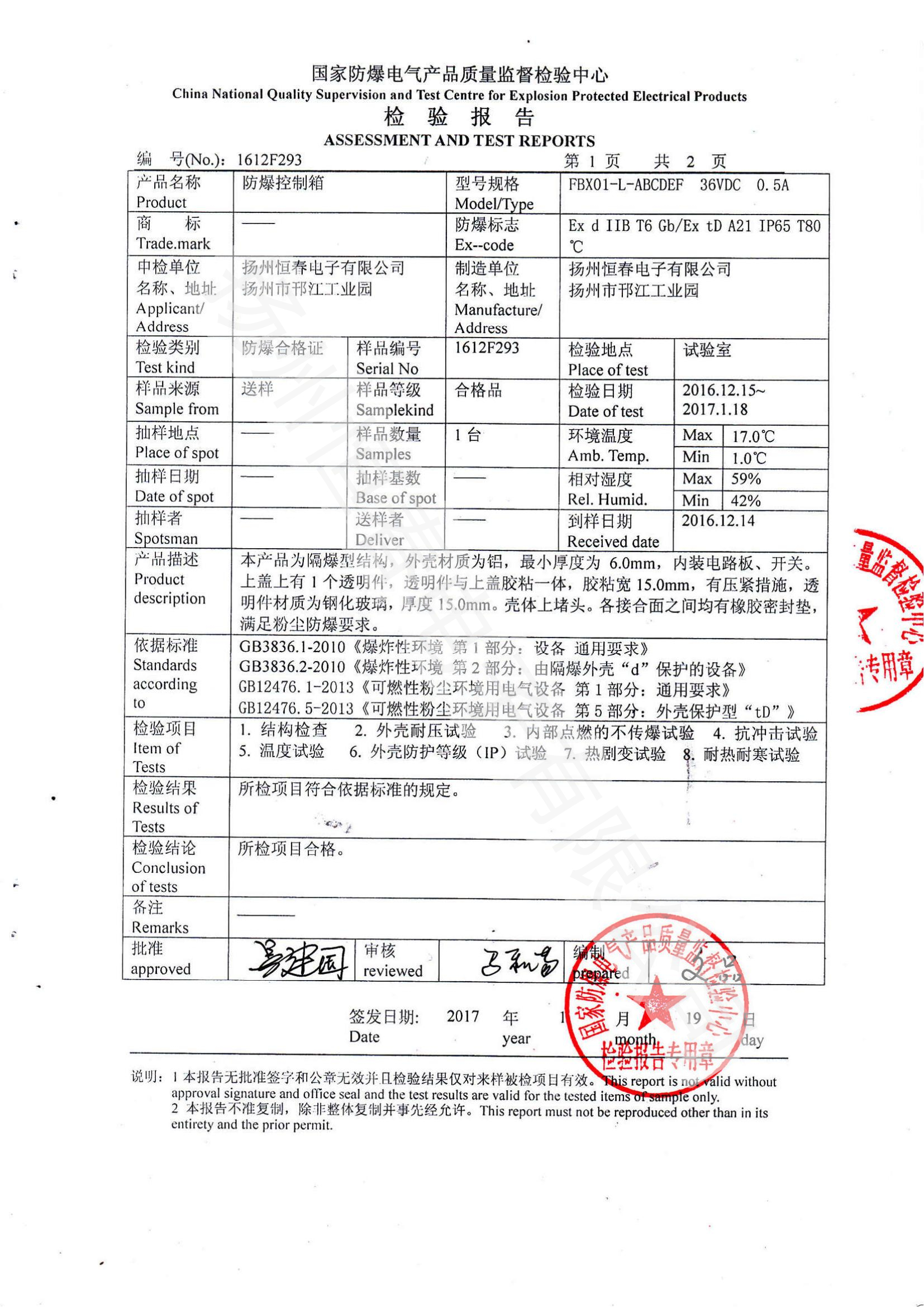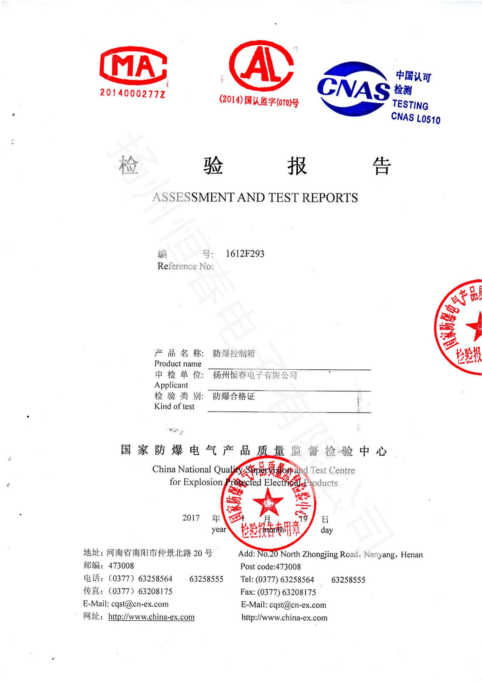 1612F293 防爆控制箱检验报告
